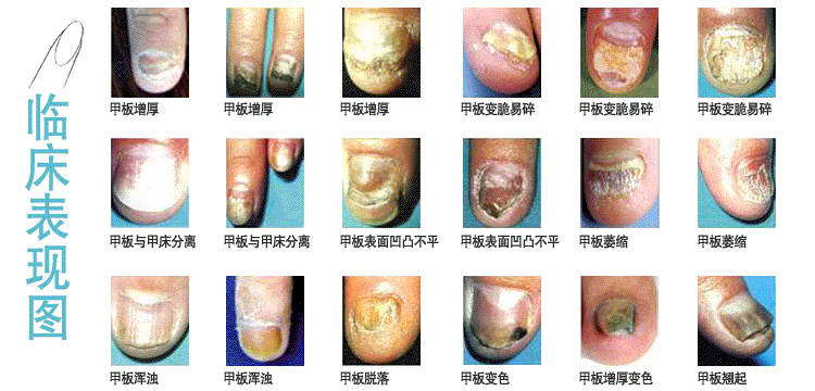 多呈灰白色,且失去光泽;甲板增厚显著,表面高低不平。其质松碎,甲下常有角蛋白及碎屑沉积。有时,甲板可与甲床分离。下面是灰指甲的图谱,如果你怀疑自己得了灰指甲,可以对照下面谱图;如果你还是不能确定,可以咨询灰指甲在线医生,帮你诊断病情。