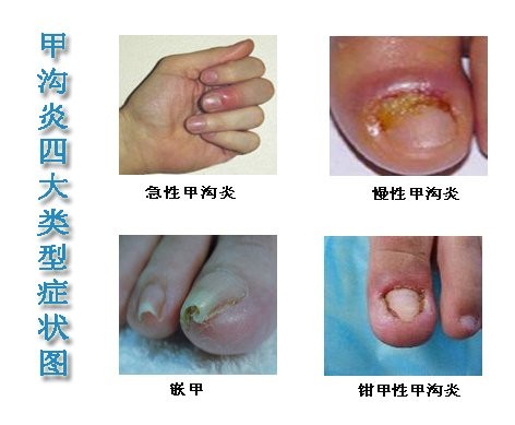 甲沟炎是因为趾(指)甲生长方向不正确,引起趾(指)甲旁组织发炎,红肿、痛、流脓等症状。发炎时间久了,组织产生肉芽肿,使趾(指)甲越陷越深,不容易自愈。好发於大姆趾。病菌从伤口侵入,沿甲沟扩散。此时皮下组织充血、水肿、白细胞趋化,继而损伤的组织细胞变性、坏死、液化;形成半环形脓肿。