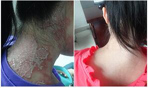 治疗前:王女士家在无锡,六年前发现后颈处有一小块牛皮癣,自己用了一些小偏方也没在意,去年牛皮癣突然爆发,遍及全身,跑了好多医院始终治不好,几次想轻生。
