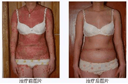治疗效果:1个疗程控制病情为静止期,避免了继续扩大的可能,2个疗程后,王女士身上的牛皮癣进入退行期,破损部位每天都在减少,再过1个疗程后,几乎看不出痕迹了,皮肤恢复了以往的健康整洁。