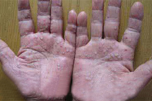 2、脓包型牛皮癣:初起为炎性红斑,继而在红斑上发生密集的、针头至粟米大小的、浅在的无菌性脓疱。部分可融合或增大呈“脓”状。常因脓疱破裂而糜烂。脓疱在数天后干涸。