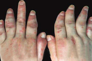 3、关节型牛皮癣:关节病型牛皮癣很少见,任何年龄均可发生,可同时发生于大小关节,但常见是手腕、手指及足趾小关节,脊柱关节也可发生。病变的关节有红肿、疼痛。