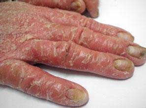 4、红皮型牛皮癣症状:初起时在原有银屑病皮损部位出现潮红,迅速扩延成大片,最后全身呈现弥漫性潮红浸润,在弥漫性潮红浸润中,常有片状正常“皮岛”。