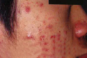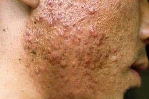 7、恶病性青春痘:皮肤损害为小米粒至蚕豆大小的青红色或紫红色丘疹,脓疱或结节,质地较软,含有脓液或血液。