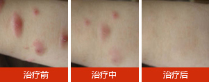 治疗前:22岁的小张,4年前,胳膊上突然起了好多小红疙瘩,很痒,去医院检查,说是荨麻疹,采用过不少的方法治疗,效果都不太理想,总是反复发作。